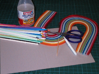 Es gibt in bestimmten Ländern, eigens für Quilling, lange Streifen die 3mm breit sind. Mit den Papuelastreifen geht es aber auch sehr gut. Um eine Form zu formen, steckt man ein Ende eines einzelnen Streifens in die Nadel und dreht ihn dann auf. Wer keine Nadel hat, kann es auch mit einem Zahnstocher oder einer Pinzette machen.