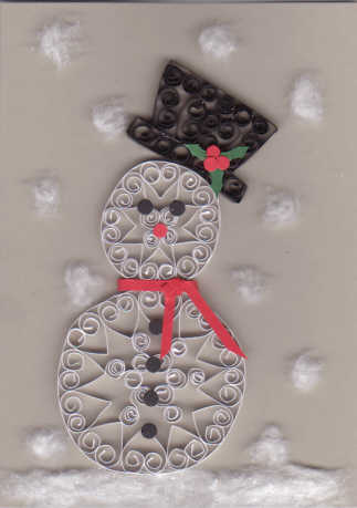 Nachdem man viele, viele Herzen und S gerollt hat, werden sie so auf die Karte geklebt, so dass ein Schneemann entsteht.